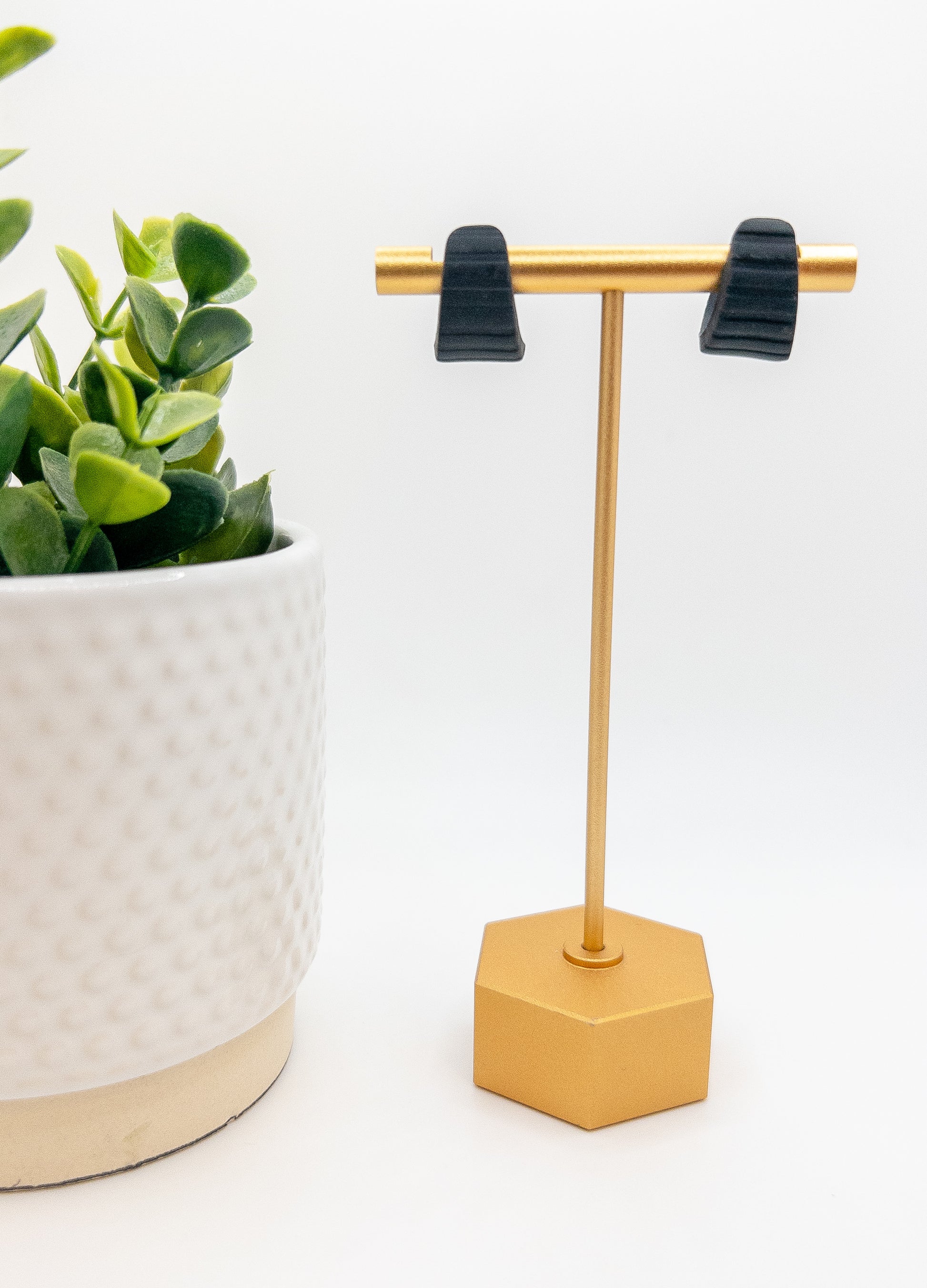 Handmade black polymer clay with ribbed texture. Hypoallergenic stainless steel posts. Super lightweight and comfy for all-day wear. An easy go-to for everyday outfits or a night out.